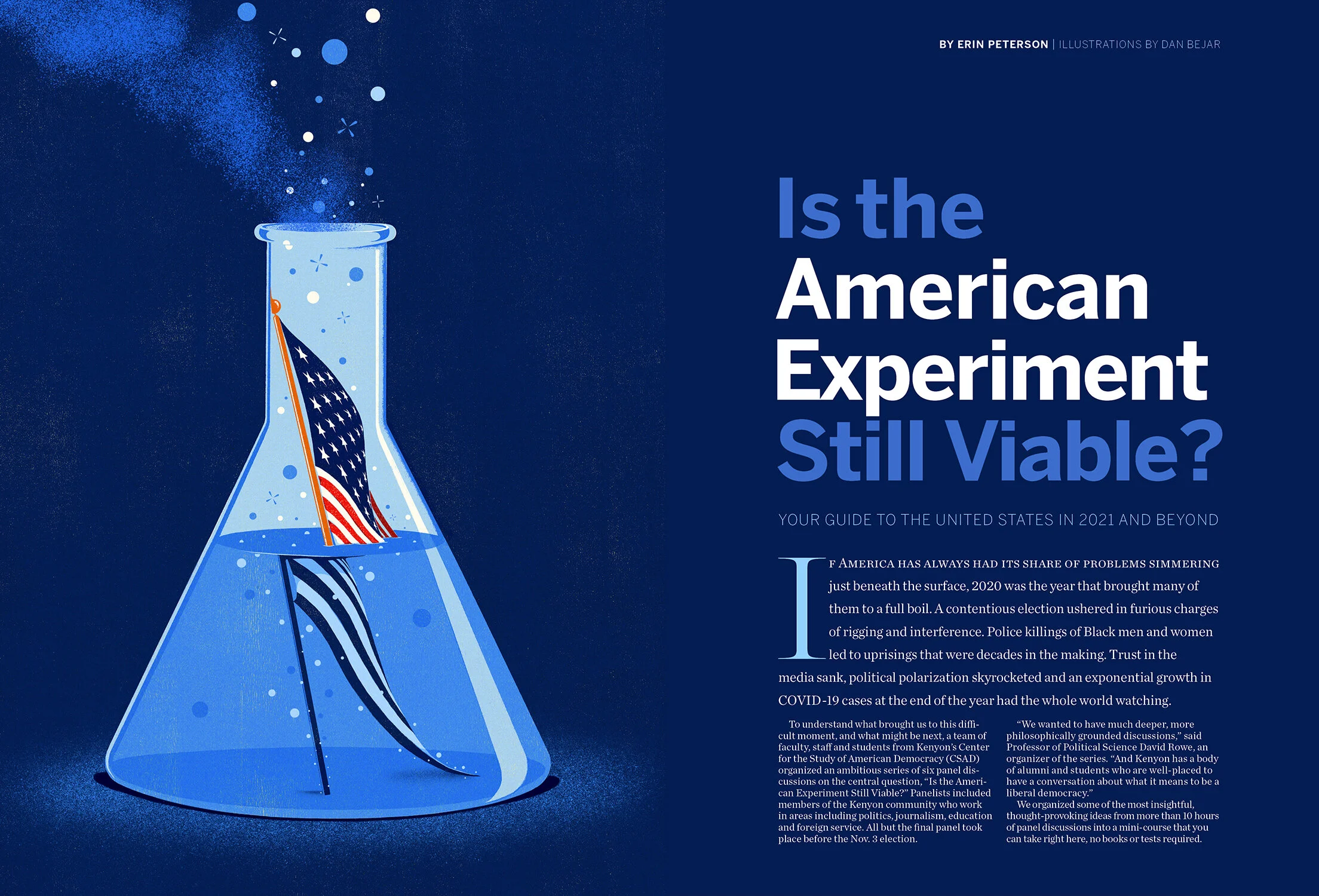 Full page opener artwork for Kenyon Alumni Magazine’s Fall/Winter 2020 cover story “Is The American Experiment Still Viable?”.