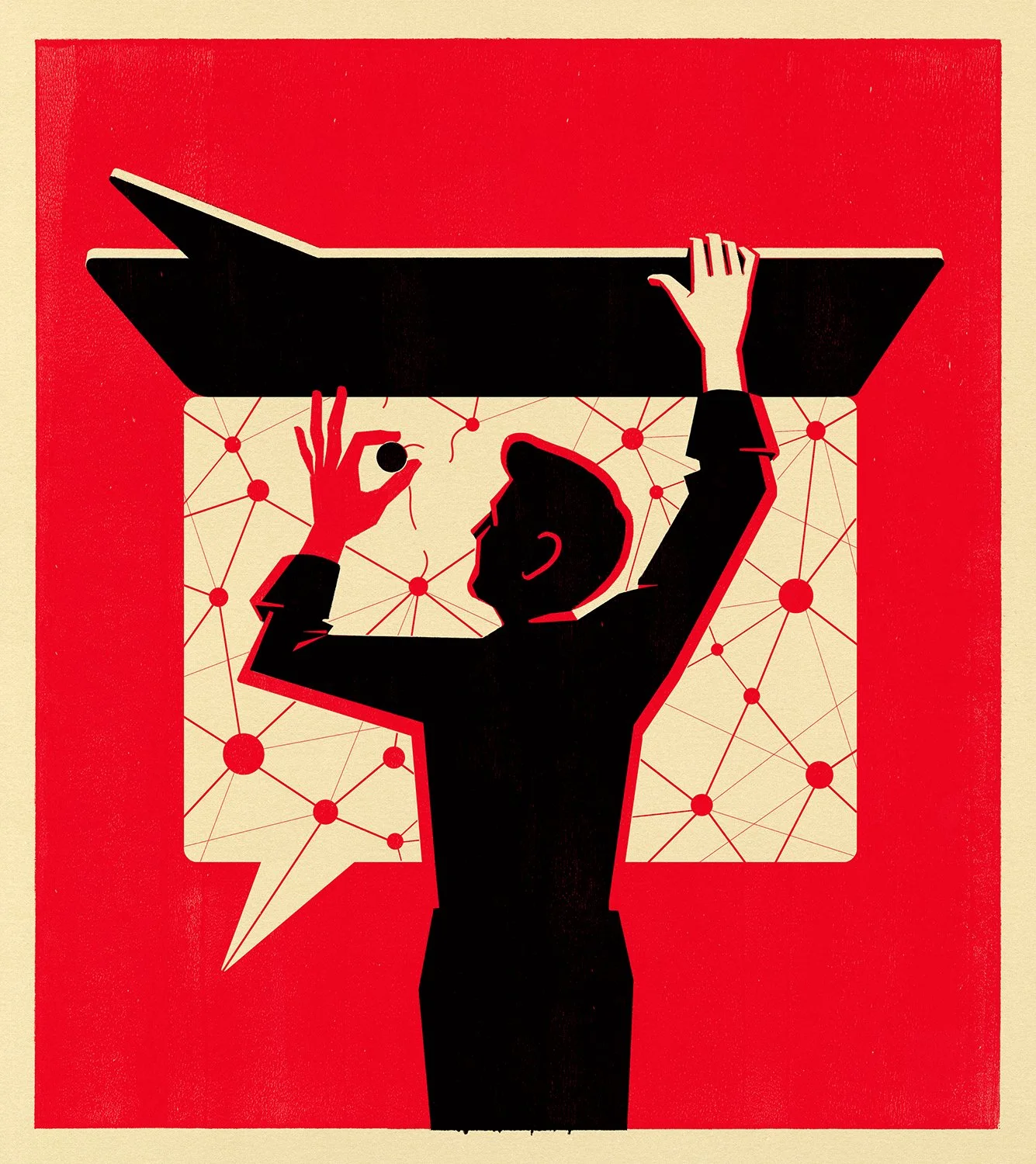 Artwork for a Harper’s Magazine cover story on the big business behind the disinformation industry.